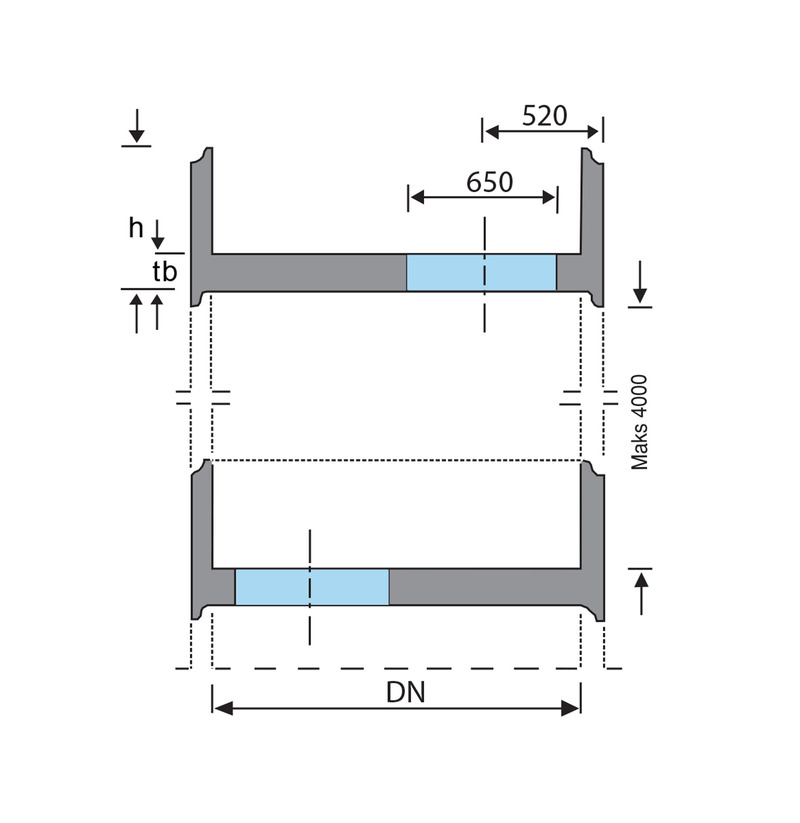 | Varenummer | Beskrivelse | DN (mm) | Høyde h (mm) | tb (mm) | Vekt (Kg) | Pris eks. mva |