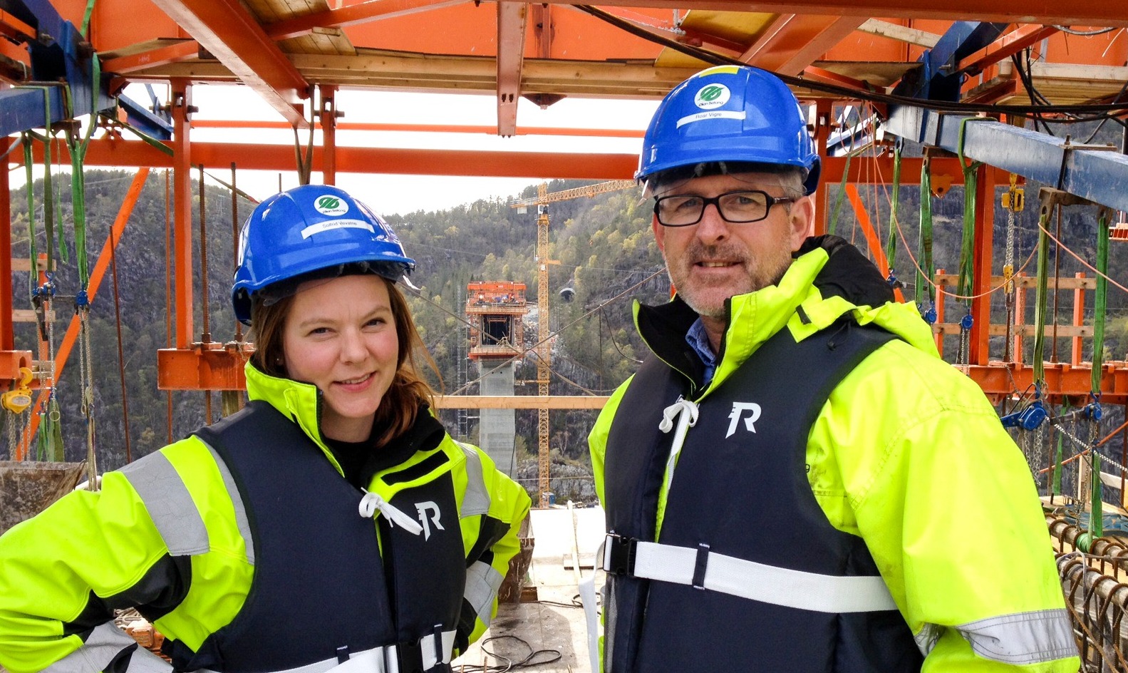 To av Ølen Betongs teknologer ute på Sandsfjordbrua under byggingen: Solfrid Vevatne og Roar Vigre. Foto: Ølen Betong