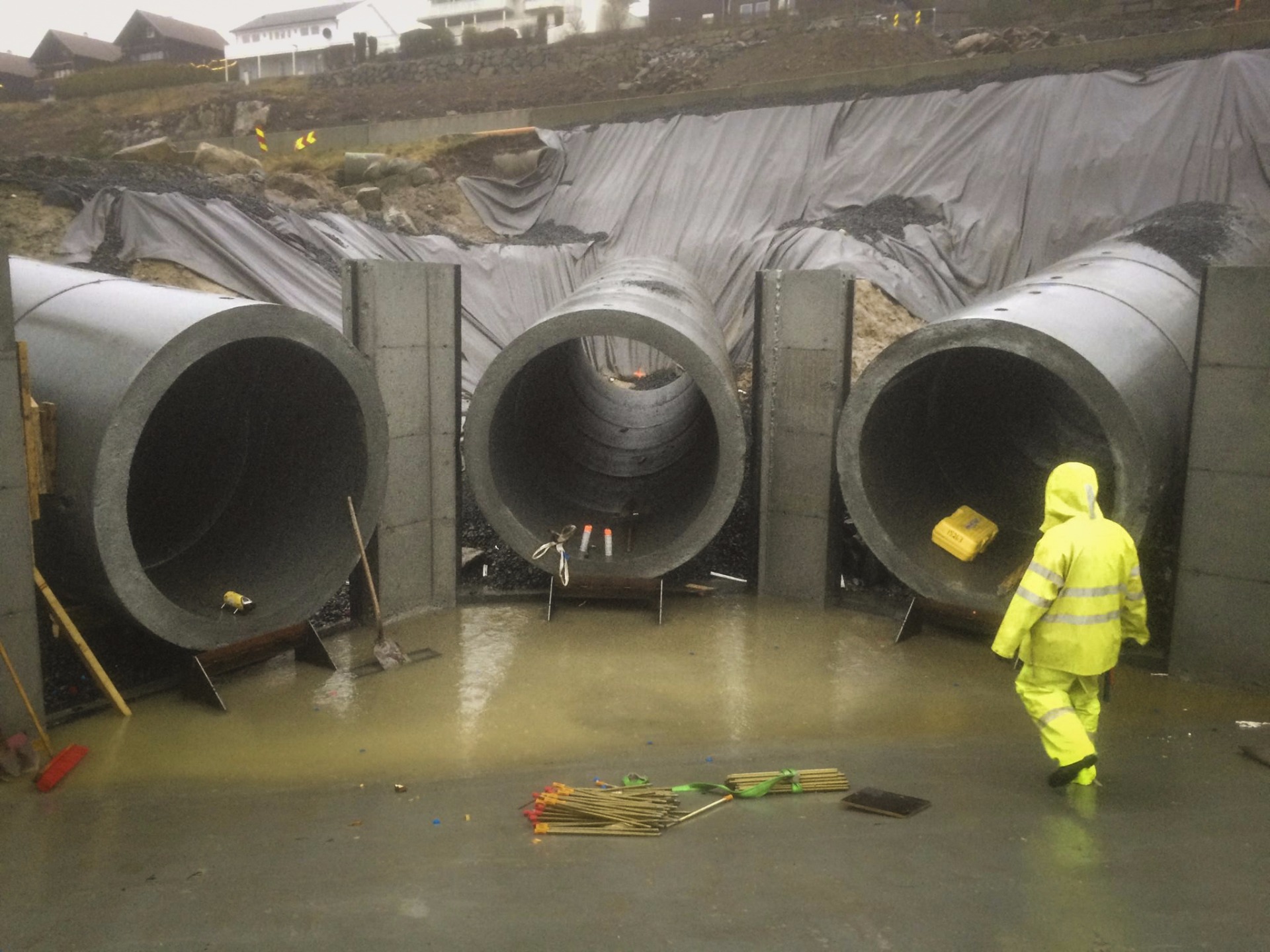 Nærmere bestemt 11.500 tonn falsrør og 20-25 spesialproduserte kummer, hver og en på 15-20 tonn.Bare et par uker etter at Risa signerte kontrakten med Ølen Betong i september, gikk første betongleveranse sørover fra Ølen, den første av totalt 500 transporter med ca. 30 tonn på hvert lass.
